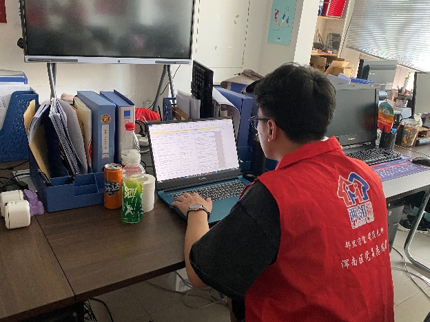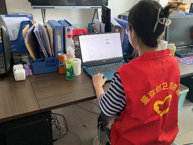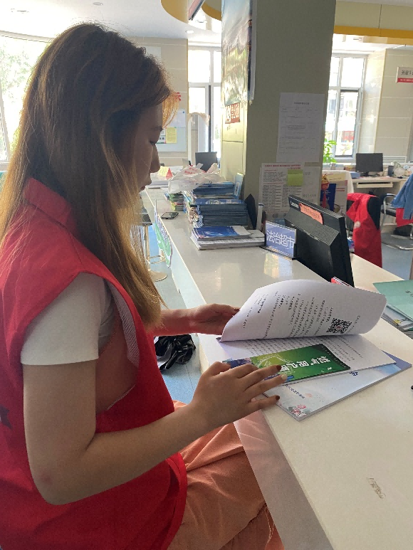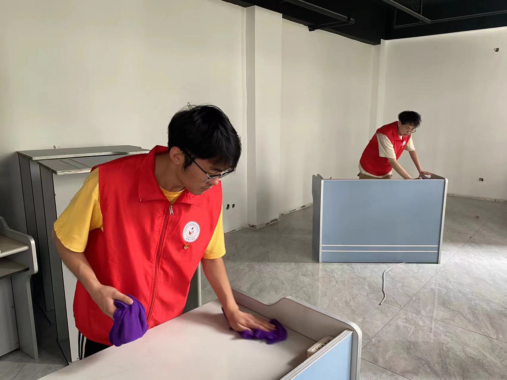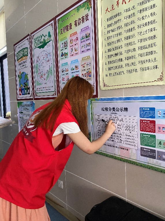 第三组党员志愿者在天街社区工作人员带领下对社区工作环境进行清理,整理相关文件,辅助社区开展法制、垃圾分类宣传等活动。