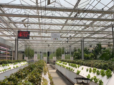 随后,实践团师生共同参观了塔元庄同福乡村振兴示范园的智慧农场里,恒温恒湿环境下的有机蔬菜伸展着嫩芽,鱼菜共生、气雾栽培、立体农业、南果北种…… 现代化种植新技术让这里展现出勃勃生机的景象,让实践队全体师生真切感受到科技兴农的重要。