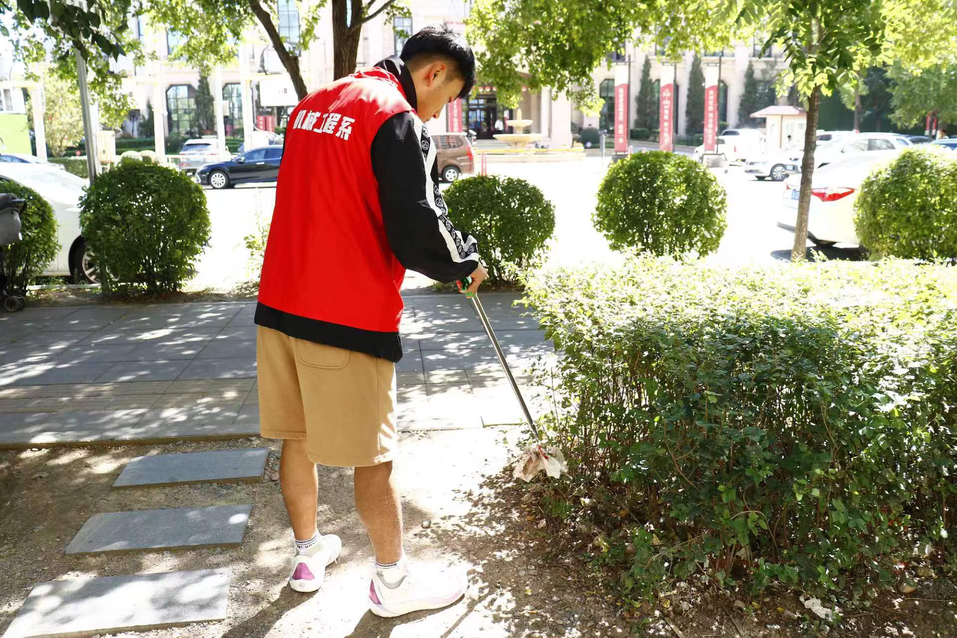 活动中,机械工程系青年志愿者们身穿红马甲,齐心协力、分工合作,手拿扫帚、铲子、垃圾袋等清洁工具,对杂草、落叶、烟头、纸屑等垃圾进行仔细清理,不放过任何卫生死角,有效提升了小区的卫生环境水平。大家干劲十足,不怕脏,不怕累,充分发扬了埋头苦干、任劳任怨、吃苦耐劳的精神。天朗气清、秋风习习,志愿者们井然有序,一起打造更加美好的社区环境,呈现出一道靓丽的风景线。