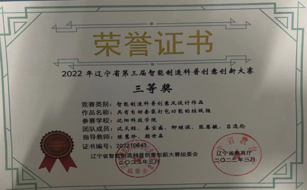 2023年3月,荣获2022年辽宁省第三届智能制造科普创意创新大赛省三等奖