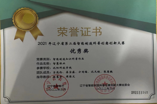 2022年3月,荣获2021年辽宁省第二届智能制造科普创意创新大赛优秀奖