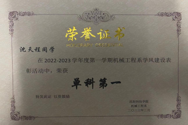 在学习上,他积极进取,始终保持端正的学习态度,积极配合老师教学,同时他还担任学习委员,班里的学风建设成绩也在系内名列前茅。他本人专业平均成绩都在89分以上,在2020-2021学年期末考试中取得了专业第一的成绩,在校期间荣获2022年辽宁省政府奖学金,2022年沈阳市“十百千”优秀大学生的荣誉称号,同时获得了2021-2022学年校一等奖学金,2020-2021学年校二等奖学金,2021-2022学年校三好学生等荣誉称号。
