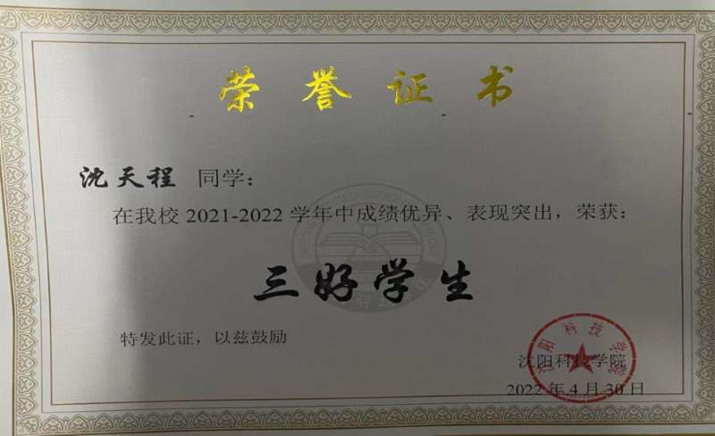 2022年4月,荣获太阳成tyc7111cc集团2021-2022学年校三好学生