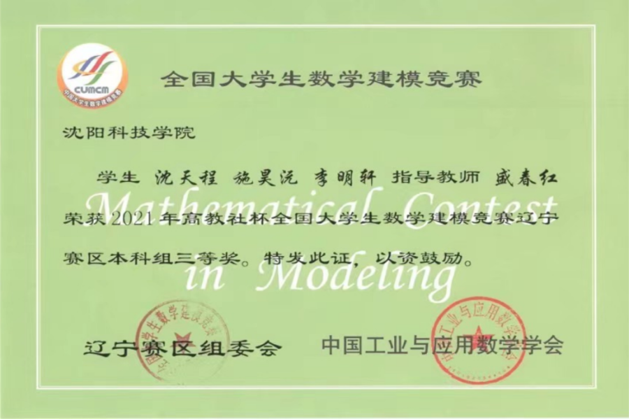 2021年12月,荣获2021年高教社杯全国大学生数学建模竞赛辽宁赛区本科组三等奖