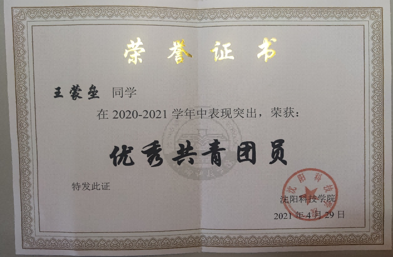 2018至2020年入伍参军获优秀士兵称号,在校期间荣获辽宁省优秀毕业生、辽宁省数学建模竞赛三等奖、优秀共青团员,数维杯大学生数学建模竞赛本科组优秀奖。