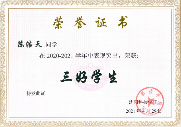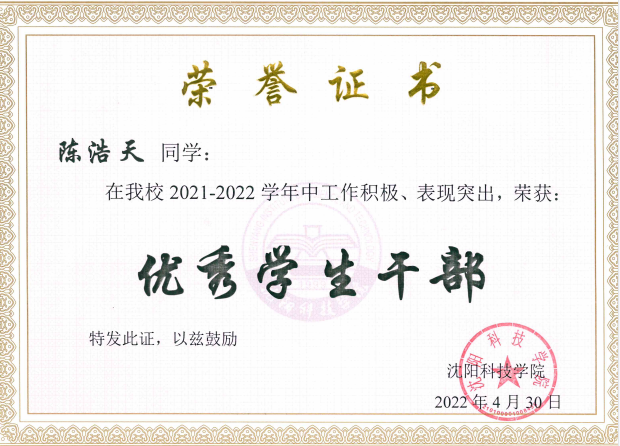 在校期间曾连续三年获得优秀学生干部、三好学生荣誉称号,创新创业大赛方面荣获辽宁省首届智能制造科普创意创新大赛三等奖、辽宁省第二届智能制造科普创意创新大赛二等奖、实用新型专利两项。
