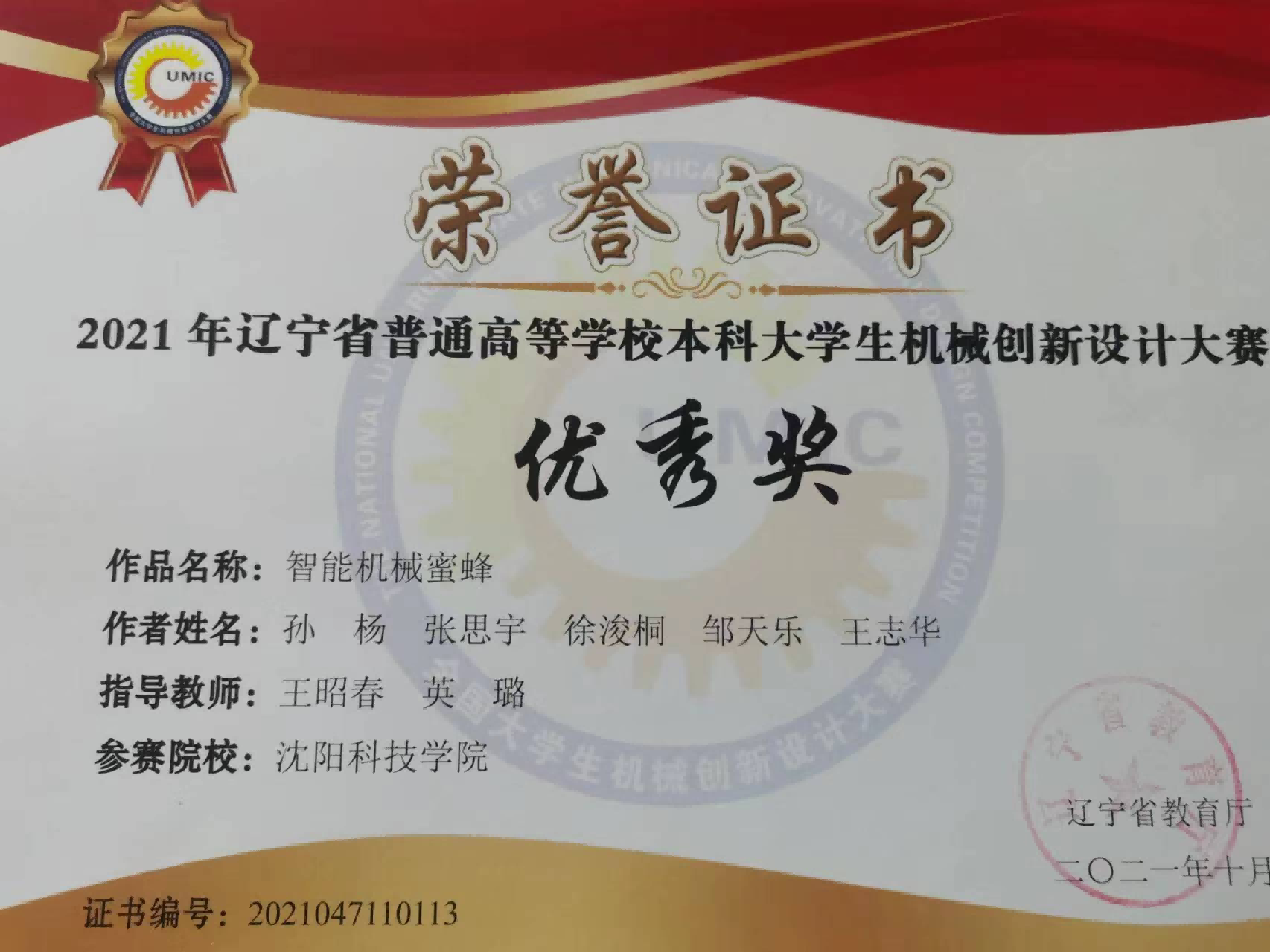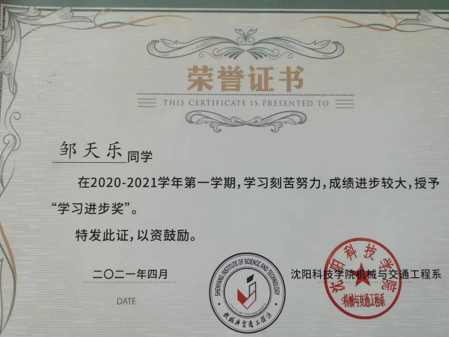 在校期间荣获2021年普通高等学校本科大学生机械设计创新大赛优秀奖。