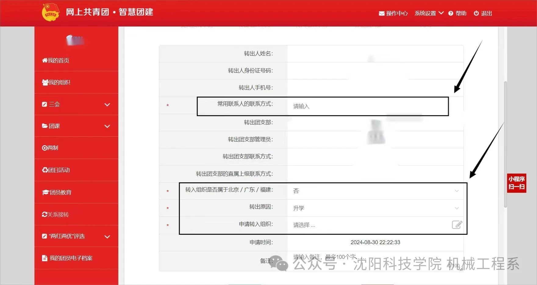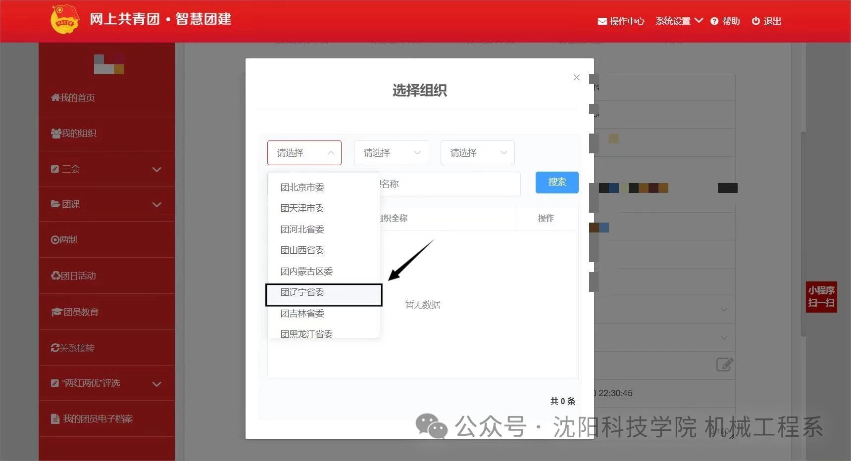 5.进入“申请转入组织”界面辽宁省,省管高校,太阳成tyc7111cc集团机械工程系专业班级团支部 注意:不是团沈阳市委