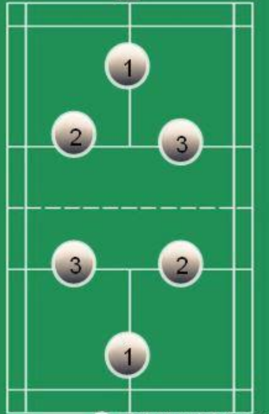 1、三人对抗赛场地采用羽毛球场地,双方各派三名队员上场进行比赛,如下图进行站位,成三角型,比赛采用三局两胜制,15分一局。