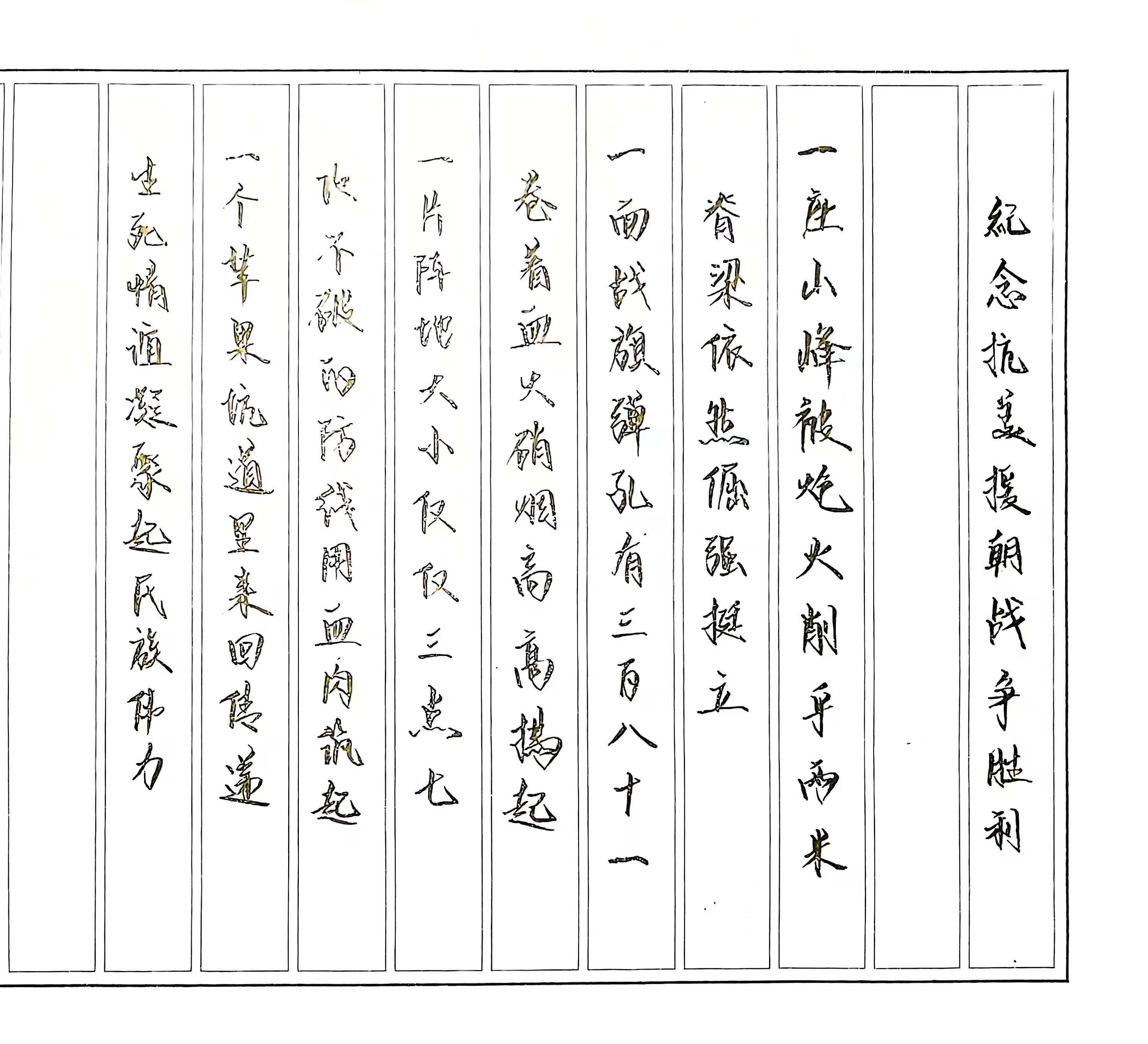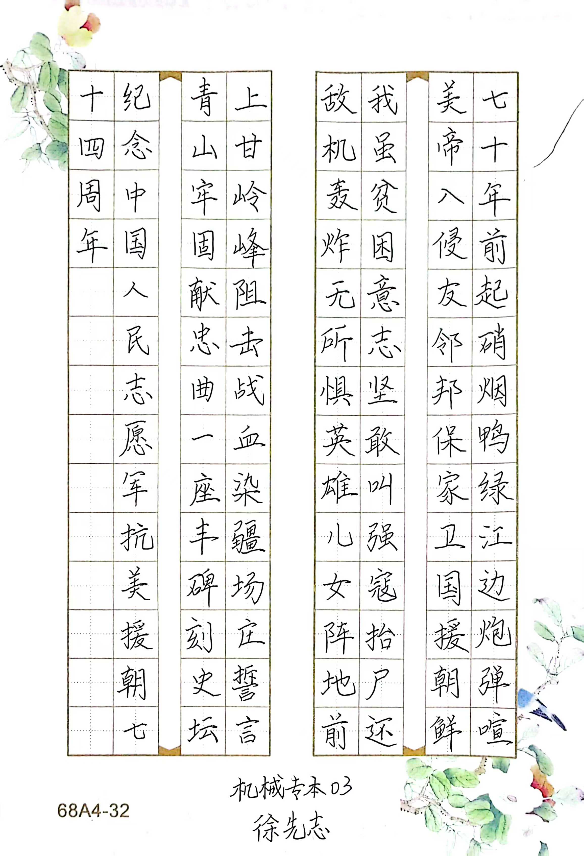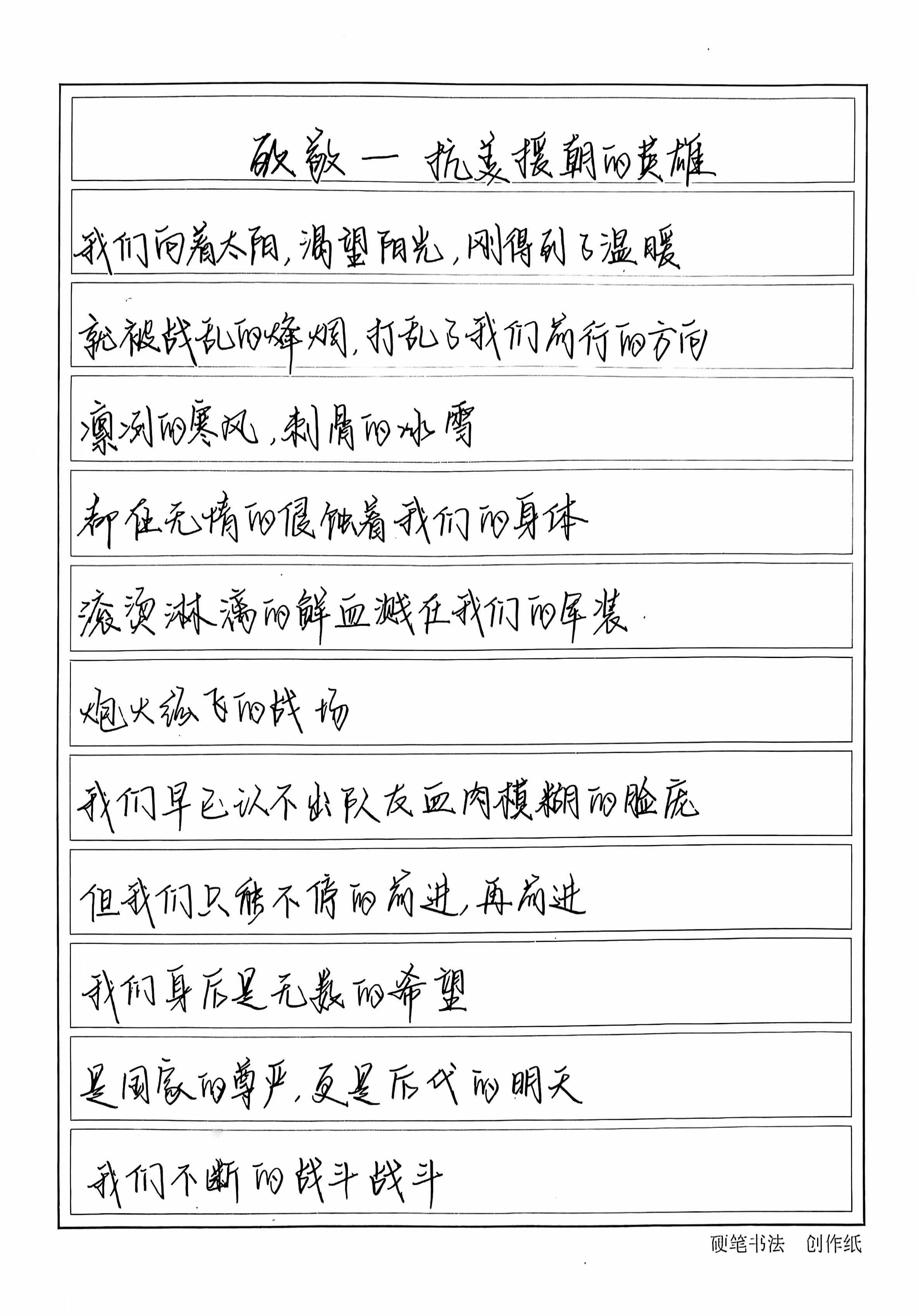 为贯彻落实习近平总书记在纪念中国人民志愿军抗美援朝出国作战70周年大会上的讲话精神,引领广大青年铭记历史,缅怀先烈,传承和弘扬伟大的抗美援朝精神,同时也为了弘扬中华民族的优秀传统文化,繁荣书法绘画艺术,提高学生的艺术修养、审美情趣。近日,我系举办“翰墨飘香”弘扬抗美援朝精神书画大赛活动。