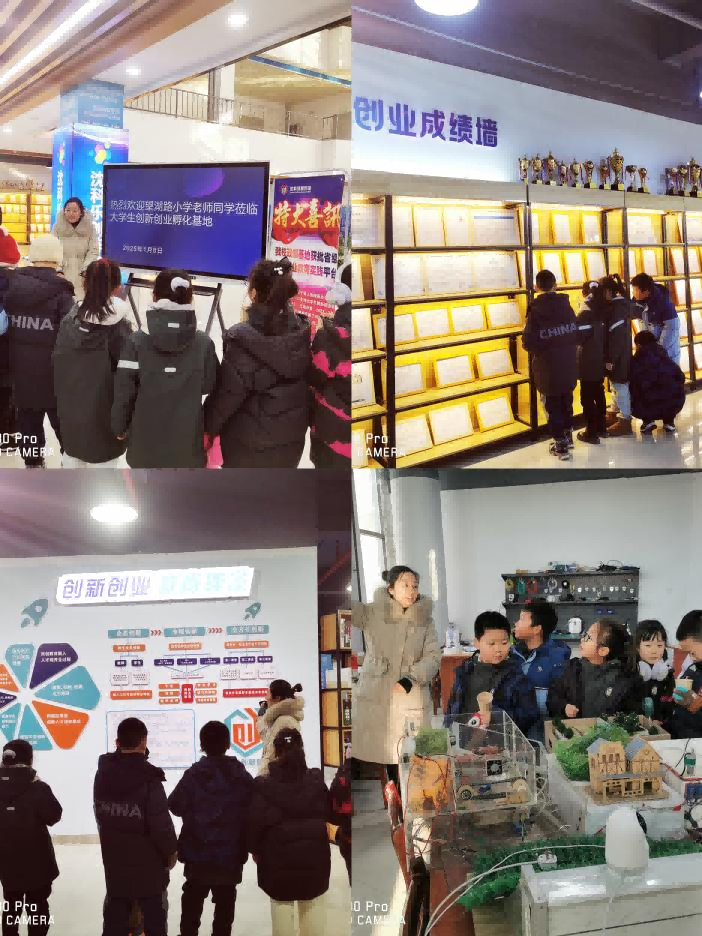 告别了充满红色气息的育人实践基地,孩子们来到了此次参观的第二站 —— 大学生创新创业基地。在这里,创新创业教师史萌萌热情接待各位小朋友,史老师首先对创新创业基地整体情况做了详细介绍,随后为小朋友们展示了本校学生自主设计研发的智能投篮车,其通过启动驱动电机让机械臂和传动轴运动,进而实现投篮动作,引得孩子们阵阵惊叹。接着,小朋友们依次参观了机器人工坊、电子设计工坊、直播实训区、数模工坊、化工工坊、智创思政工坊、文创工坊、3D打印工坊等多个特色工坊,最后驻足在创新创业成绩墙前,感受着我校学生的创新成果与拼搏精神。
