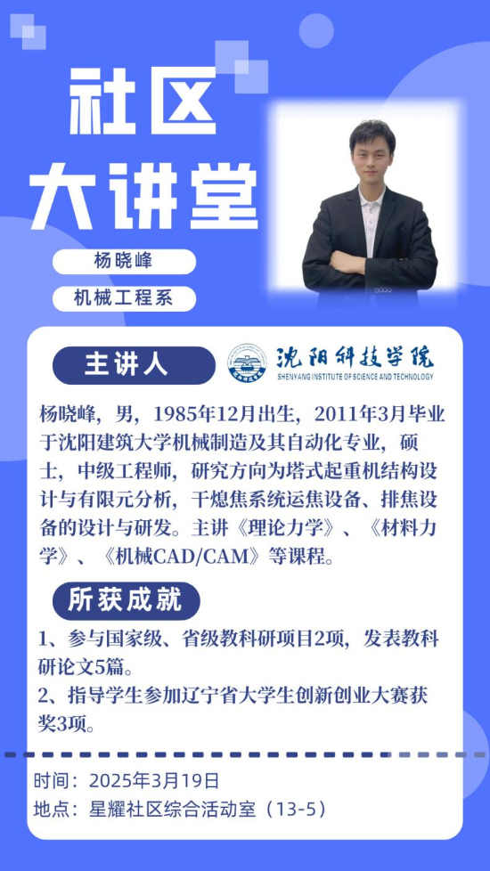 3月19日下午,机械工程系杨晓峰老师在“一站式学生社区”多功能活动室带来了一场别开生面的学术讲座——《从生活物件到机械装备的力学奥秘》。本次活动以“学术赋能成长”为主题,通过生活化案例解析抽象力学理论,吸引了近百名师生参与,现场互动热烈,为学生们打开了一扇探索机械工程科学的大门。