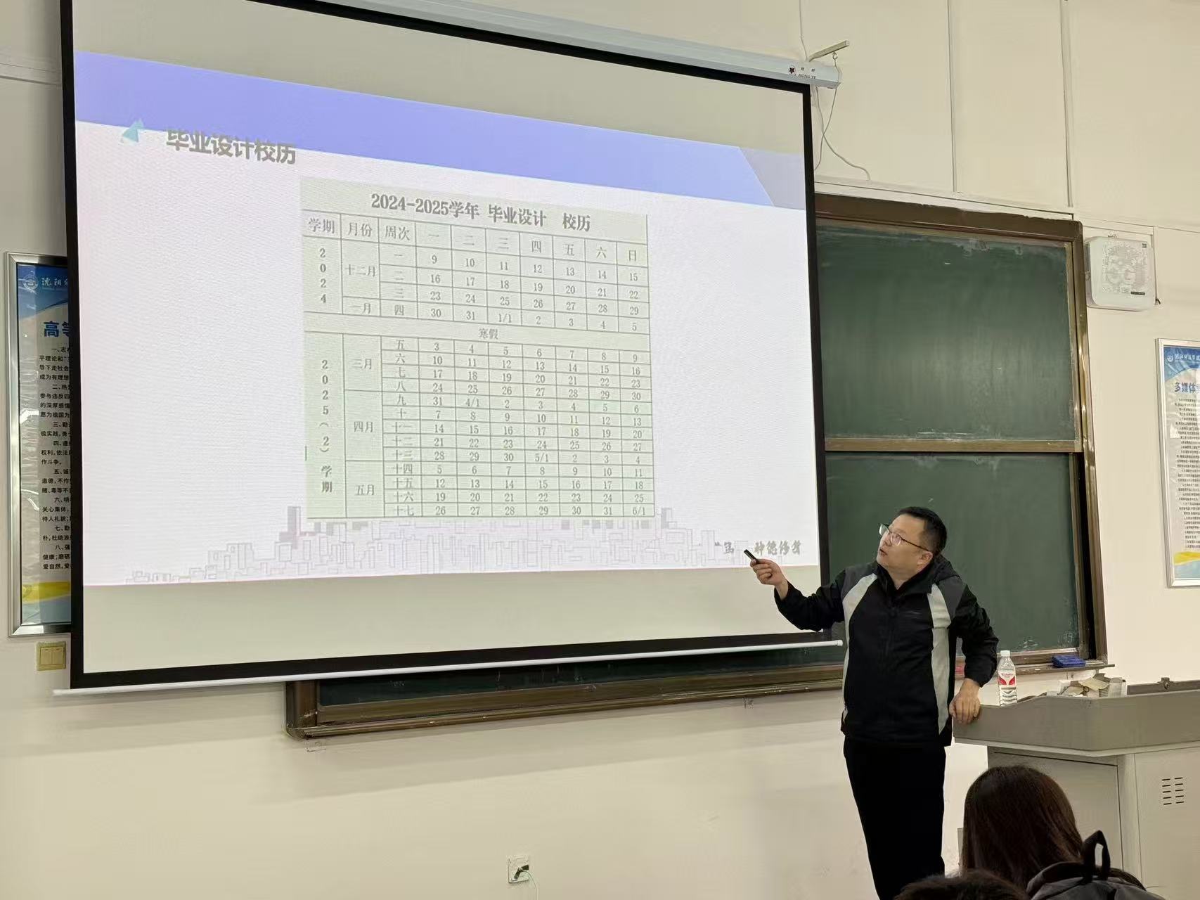 最后,辅导员张雨晶老师针对毕业设计情况,对学生提出了具体要求。她希望同学们能够积极主动地与老师沟通毕设相关内容,明确任务目标,尽早完成各个节点的任务,避免临近毕业时手忙脚乱。她还强调了时间管理的重要性,提醒同学们合理安排时间,确保毕业设计与毕业实习等其他事务能够兼顾。