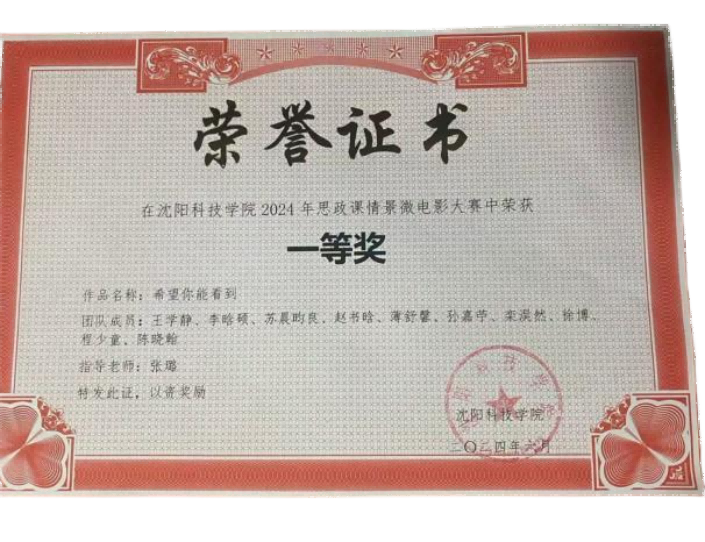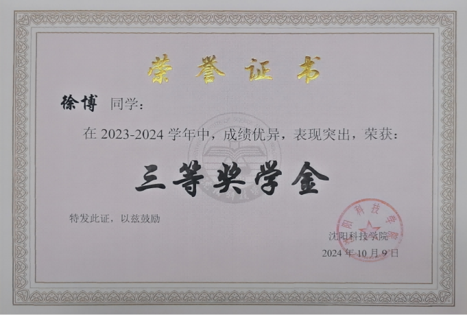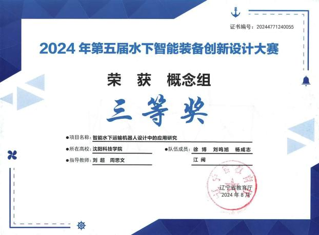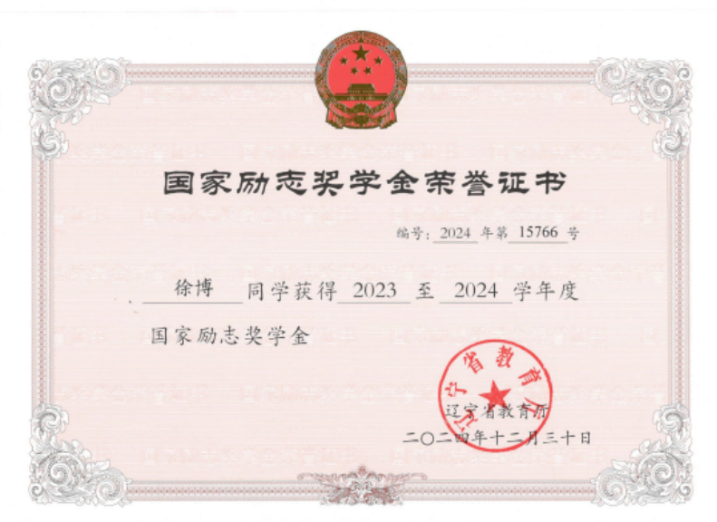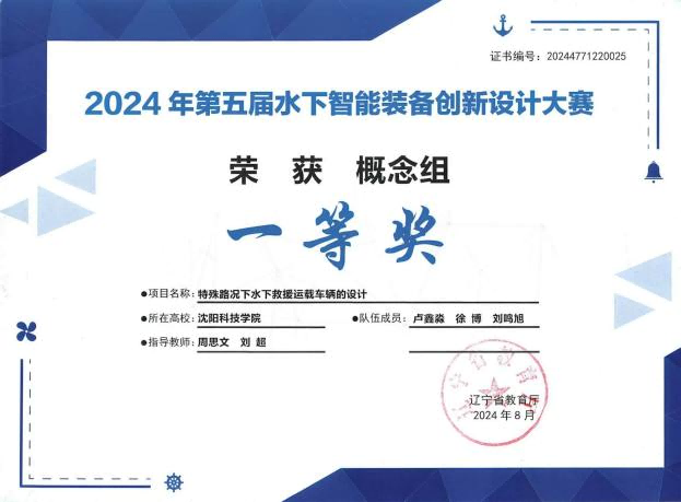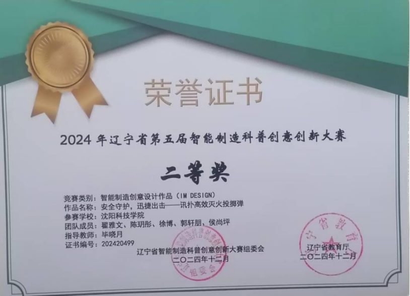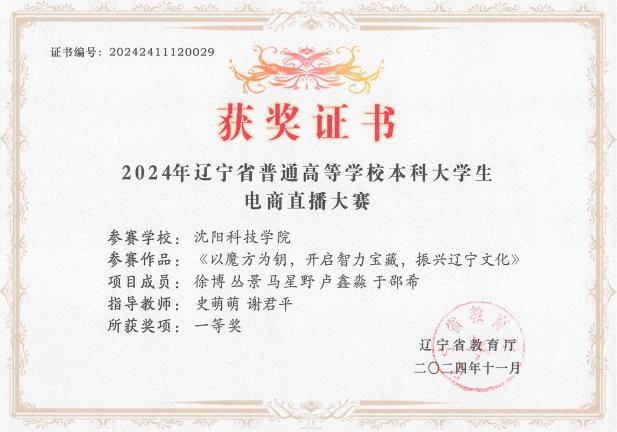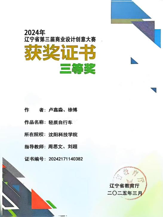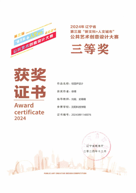 2023—2024学年国家励志奖学金;辽宁省教育厅办公室2024年国家及省级大学生创新训练计划立项中获得国家级立项1项、校级立项2项;2024年第五届水下智能装备创新设计大赛一等奖、三等奖;2024年第四届“第嘉杯”辽宁省普通高等学校大学生中华优秀传统文化创新设计大赛获一等奖1项、二等奖2项、三等奖2项;2024第五届辽宁省智能制造科普创意创新大赛获二等奖2项;2024年辽宁省普通高等学校本科大学生电商直播大赛获一等奖1项;2024年第三届“新文科+人文城市"公共艺术创意设计大赛一等奖1项、三等奖4项、优秀奖4项;2024年第三届商业设计设计大赛一等奖1项、二等奖1项、三等奖1项;2024年辽宁省两岸新锐设计竞赛“华灿奖”一等奖1项、二等奖1项、三等奖1项;2024年辽宁省大学生动漫与媒体学院奖暨辽宁省大学生动漫与媒体创意设计大赛二等奖4项、三等奖4项、优秀奖4项;2025年在国家及省级大学生创新训练计划中获国家级立项1项、省级立项3项、校级立项7项:2025年第十三届未来设计师·全国高校数字艺术设计大赛(辽宁赛区)省级一等奖1项、二等奖1项、三等奖3项:2025年“建行杯”辽宁省大学生创新大赛(2025)中获铜奖1项、优秀奖3项:2025年辽宁省第四届大学生数字影像大赛暨第二届数据新闻大赛特等奖1项、一等奖2项、二等奖5项、三等奖5项:第十七届大学生广告艺术大赛中获一等奖1项、二等奖1项;2025年辽宁省普通高等学校大学生工业设计竞赛获一等奖1项、二等奖项2项、三等奖3项;2023—2024学年太阳成tyc7111cc集团校三等奖学金;2024年太阳成tyc7111cc集团第五届辽宁省智能制造科普创意创新大赛一等奖2项;2025年太阳成tyc7111cc集团挑战杯获二等奖1项、三等奖1项;2025年太阳成tyc7111cc集团中国国际创新创业大赛一等奖4项、二等奖2项、三等奖2项;2025年太阳成tyc7111cc集团思政课情景徽电影大赛中荣获二等奖1项;太阳成tyc7111cc集团2024年度“优秀学生干部”荣誉称号;太阳成tyc7111cc集团创新创业学院孵化基地花与花枝项目负责人。