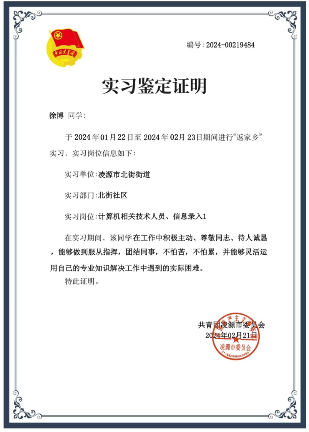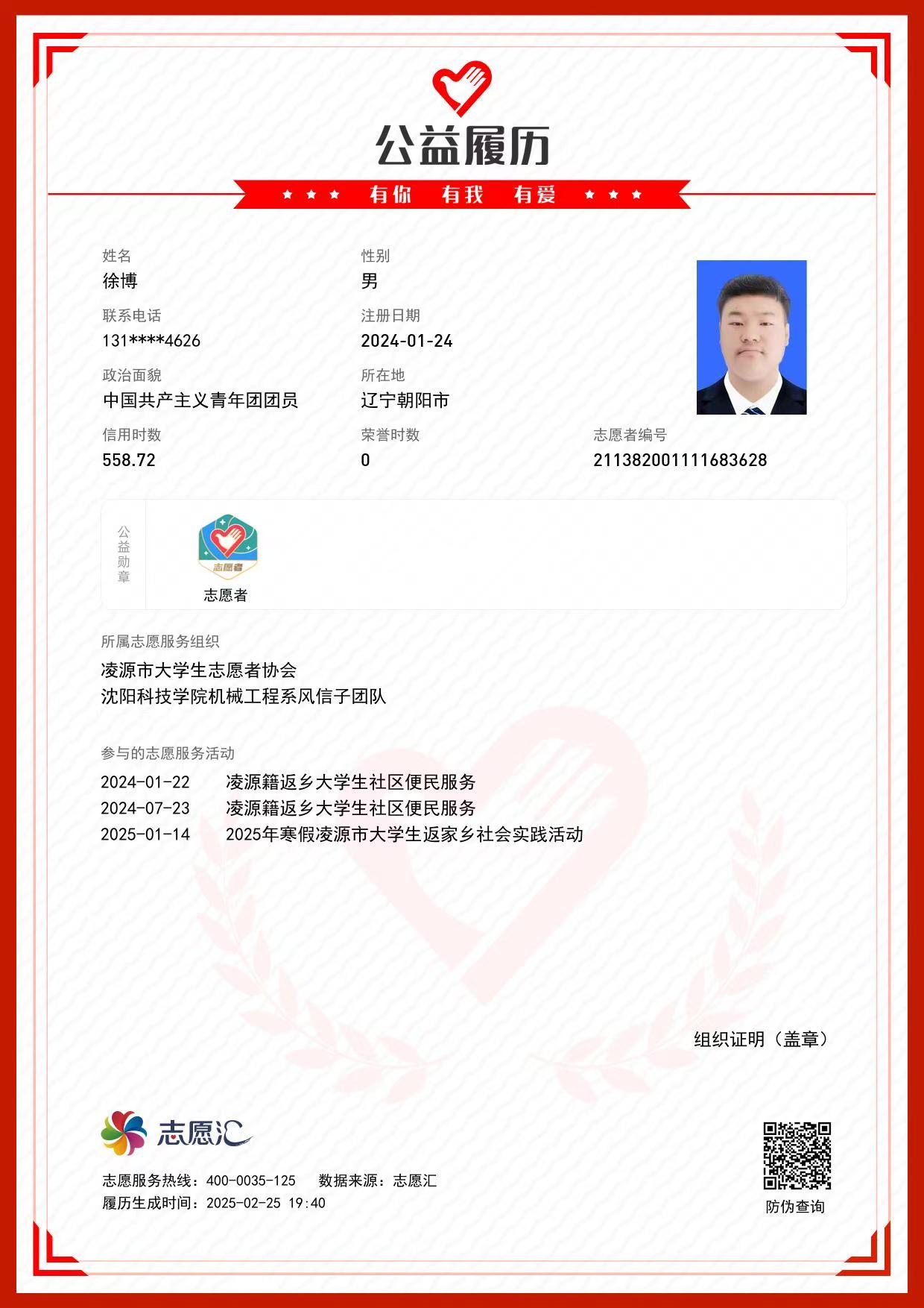 在思想方面,该生始终保持积极向上的态度,始终坚持正确的政治方向,积极向党组织靠拢,定期参加团日活动和政治理论学习,不断提升自己的思想政治觉悟。以身作则,用实际行动践行共青团员的使命与担当;在学习方面,该生勤奋刻苦,成绩优异。深入钻研专业知识,不断提升自己的专业素养和实践能力;在创新创业方面,该生勇于探索,敢于尝试。积极参与学校组织的创新创业项目,在实践中不断积累经验,提升自己的创新能力和团队协作能力。获国家及省级大学生创新训练计划国家级立项2项、省级立项3项、校级9项;斩获国家级三等奖1项、省特等奖1项、省一等奖11项、省二等奖19项及省三等奖25项;在工作方面,该生身为班级班长,该生尽职尽责,充分发挥模范带头作用。精心组织各类班内活动,如班会、专业知识学习等,增强了班级同学的凝聚力和组织活力。积极与同学们沟通交流,了解大家的思想动态,及时给予帮助和引导,营造了积极健康的班级氛围;在志愿服务方面,该生表现突出。2025年加入了中华志愿者协会,并积极参与投身红色传承,参加抗美援朝烈士陵园服务并开展精神宣讲;践行生态理念,参与植树、浑河保护活动;了解社会需求,增强社会责任感,将所学知识运用到实际中,锻炼了解决实际问题的能力。同时,该生踊跃投身“三下乡”“返家乡”社会实践,深入基层,响应号召假期返乡,服务家乡发展,在奉献中受教育、长才干、做贡献。