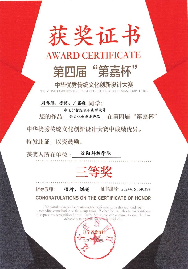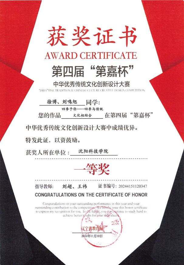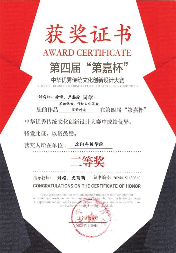 6.2024年11月获第四届“第嘉杯”辽宁省普通高等学校大学生中华优秀传统文化创新设计大赛一等奖1项、二等奖2项、三等奖1项