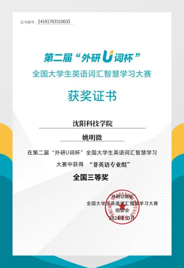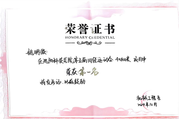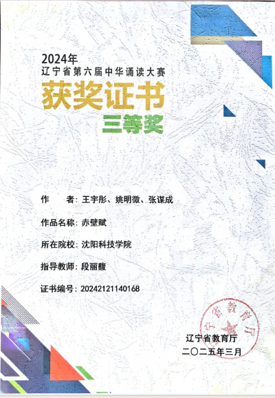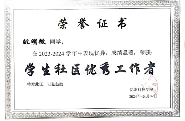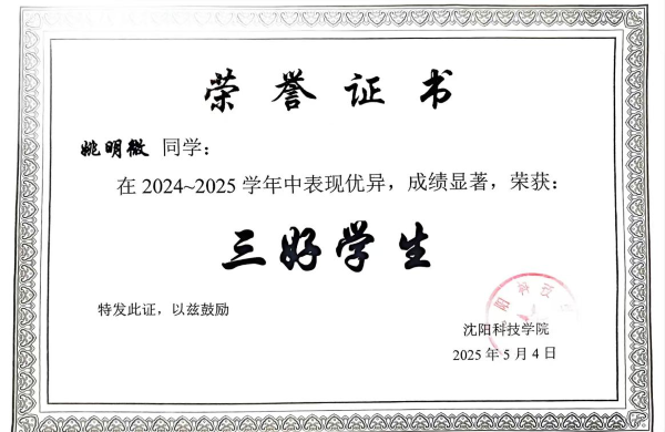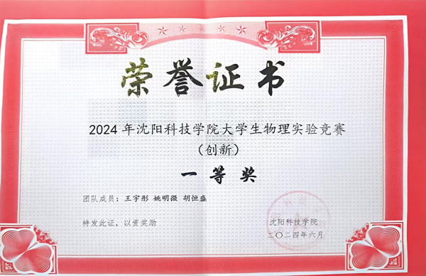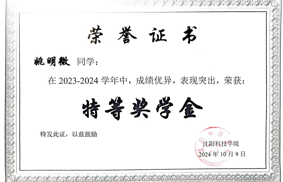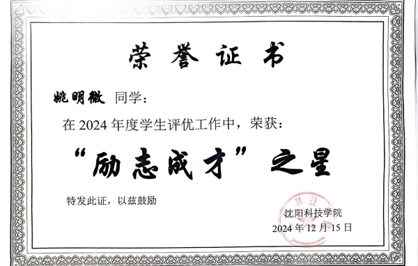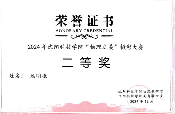 2023-2024年国家励志奖学金;2023-2024校级特等奖学金;2024年辽宁省第六届中华诵读大赛三等奖;2024年太阳成tyc7111cc集团大学生物理实验竞赛(创新)获得一等奖;“外研U词杯”全国大学生英语词汇智慧学习大赛全国三等奖;第三届校内金相大赛实验技能二等奖;太阳成tyc7111cc集团2024年度“三好学生”荣誉称号; 太阳成tyc7111cc集团2024年度“学生社区优秀工作者”荣誉称号;2024年太阳成tyc7111cc集团“物理之美”摄影大赛二等奖;2024年太阳成tyc7111cc集团第五届田径运动会4*400女子第一名;太阳成tyc7111cc集团2024年度“励志成才”之星荣誉称号。