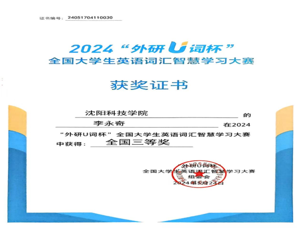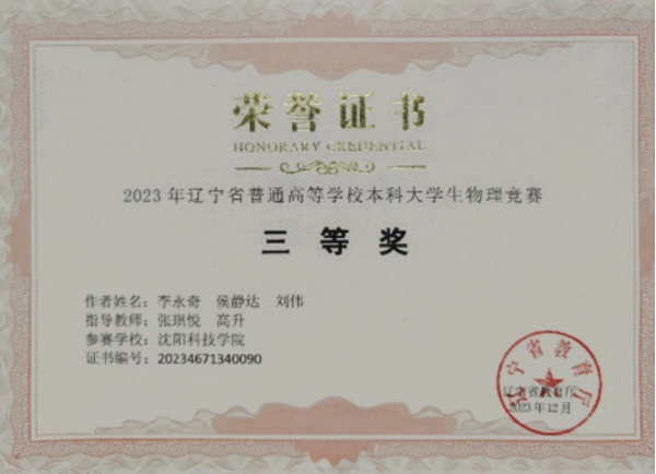 2023年辽宁省普通高等学校本科大学生物理竞赛三等奖;2024年大学生职业发展与就业竞赛初赛三等奖;2024年全国大学生英语翻译大赛省一等奖;2025年第十一届全国青年科普创新实验暨作品大赛省三等奖;2025年全国大学生绿色化妆品创新创意大赛东北赛区三等奖;第一届“外研U词杯”全国大学生英语词汇智慧学习大赛全国三等奖;2023-2024年度本专科生国家奖学金;2022-2023学年校一等奖学金;2023-2024学年校特等奖学金;太阳成tyc7111cc集团2024年度“三好学生”荣誉称号;太阳成tyc7111cc集团2023-2024学年“学习标兵”