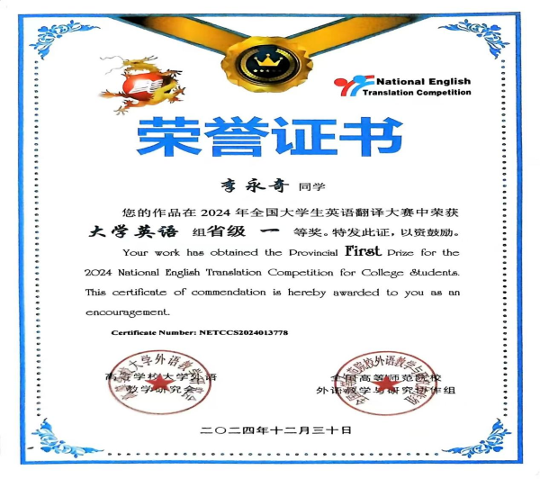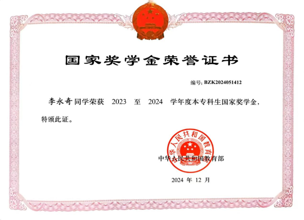 除了学习专业课以外,他深知实践是检验知识的唯一标准,注重专业课技能的学习,掌握基础知识与技能应用到比赛,将理论知识运用到实际。于是他参与到一些相关学科竞赛,真正接触到了关于学科拓展之外的一些知识点,印象深刻的就有数学建模比赛,让他接触到了建模技术;大学生物理竞赛,使得他对物理学的认知更加丰富,运用学到的物理知识实践到比赛之中,这也而是他第一次由校赛晋级到省赛的第一次比赛,通过和队员们积极备战,老师的辅导,获得省级三等奖;全国大学生英语翻译大赛,使得他对薄弱学科英语更加重视,最后取得省级一等奖以及许多校级,省级,国家级奖项。关于他的学习结果也是师生们有目共睹的,他多次参加大赛活动,获得了丰厚的荣誉奖项,于大三学年获得2023-2024学年国家奖学金。