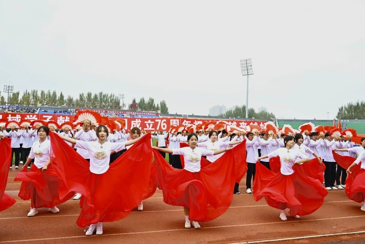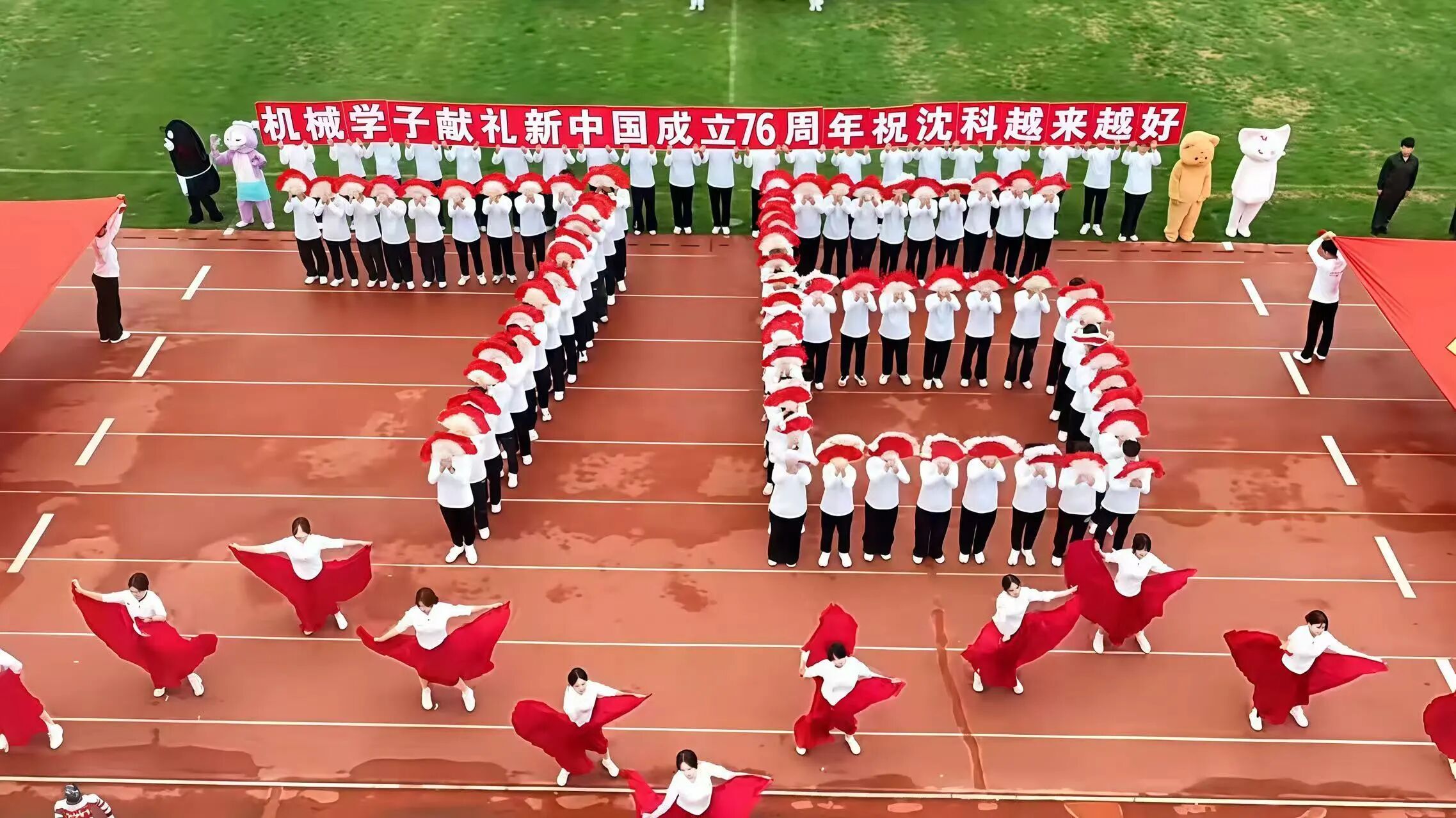 首先登场的是手持折扇的男生方阵,动作刚劲,开合整齐。一段铿锵有力的扇舞后,他们迅速变换队形,以身为笔,在绿茵场上精准绘出巨幅“76”,它不仅仅是一个数字,更是太阳成tyc7111cc全体师生对新中国76周年华诞最深情、最直接的献礼。随即,音乐转换,红衣女生如跃动的火焰翩然入场,她们柔美而活力的舞姿,与后方刚毅的“76”形成了动与静、刚与柔的完美对话,将现场气氛推向高潮。