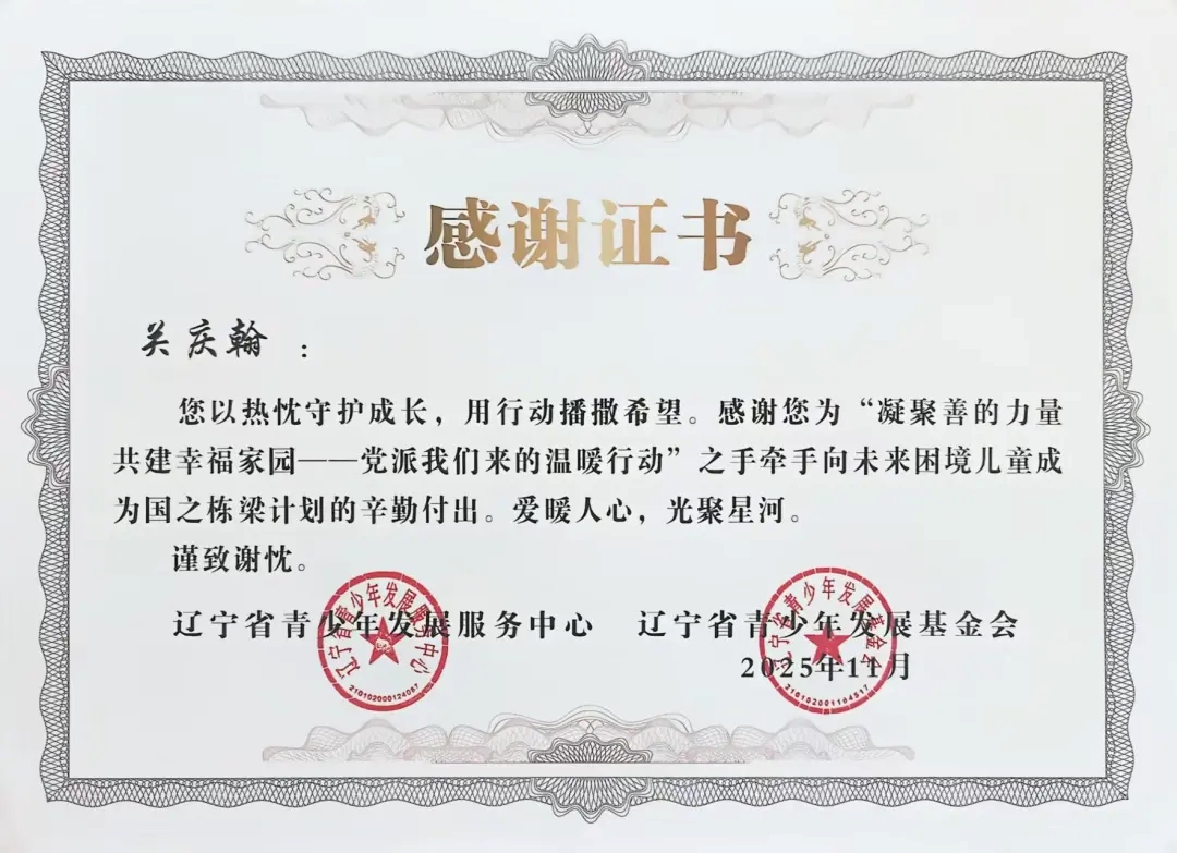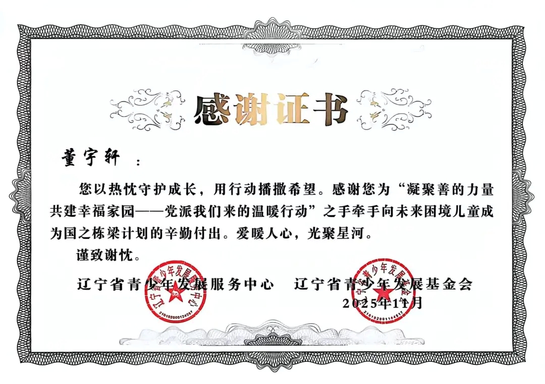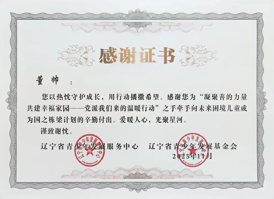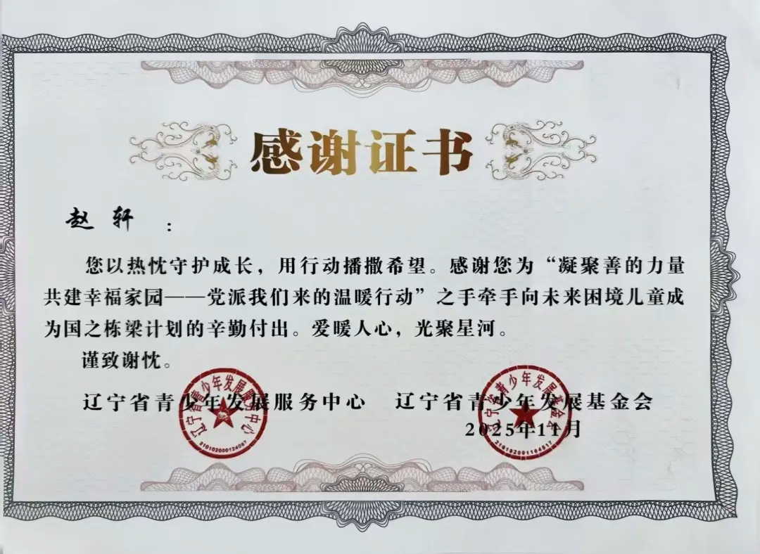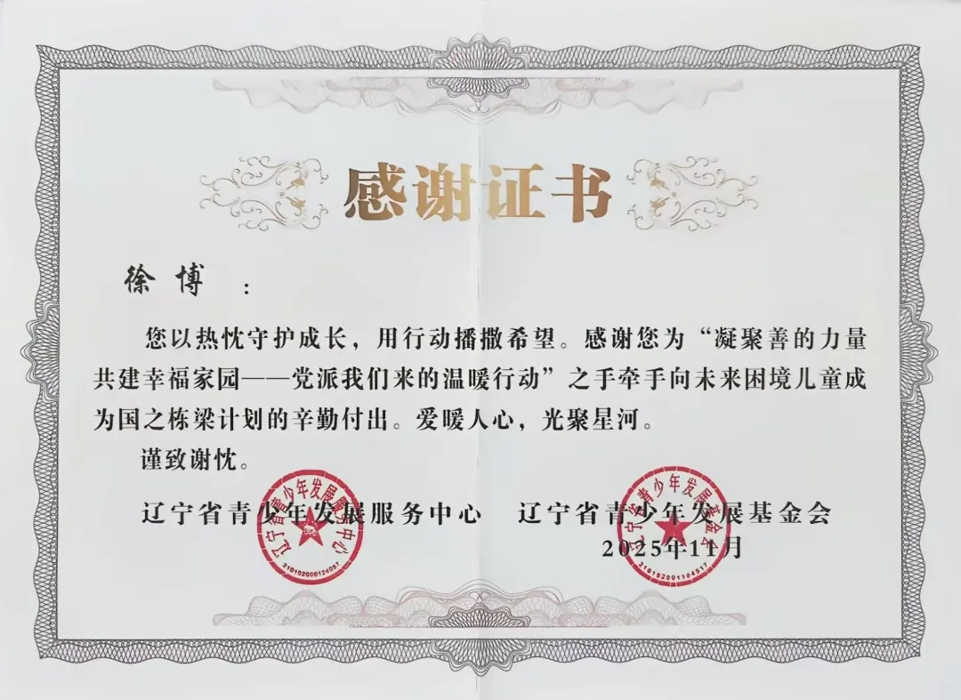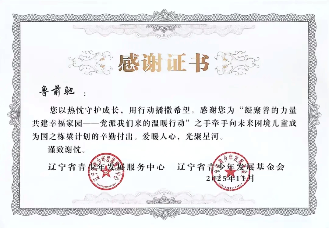 自2025年年初团省委发起“凝聚善的力量 共建幸福家园”——党派我们来的温暖行动”之手牵手向未来困境儿童成为国之栋梁计划志愿者招募以来,太阳成tyc7111cc团委高度重视,迅速组织选拔并组建了一支责任心强、富有爱心的志愿者队伍。在活动前期,志愿者们深入走访帮扶儿童家庭,详细了解每位孩子的学习、性格与兴趣,量身定制帮扶方案,真正做到“精准对接、用心服务”。在长期的帮扶过程中,志愿者们以真诚与坚持赢得了孩子们的信任,也得到了辽宁省青少年发展服务中心、辽宁省青少年发展基金会的高度认可与表彰。
