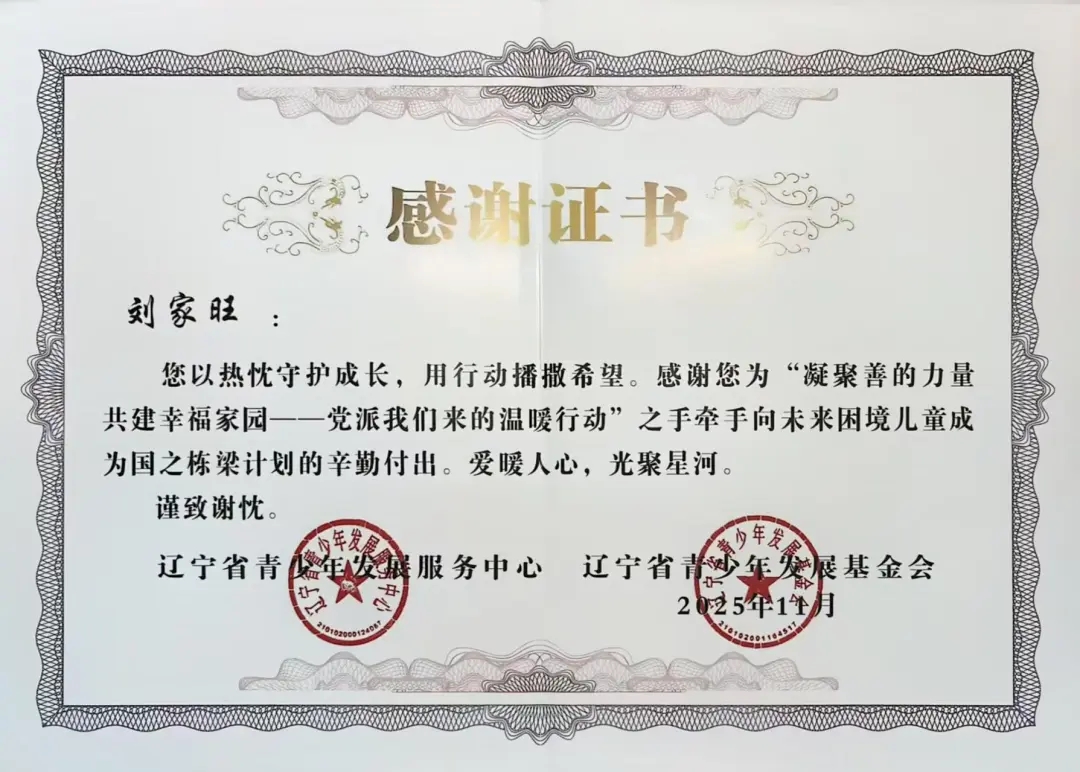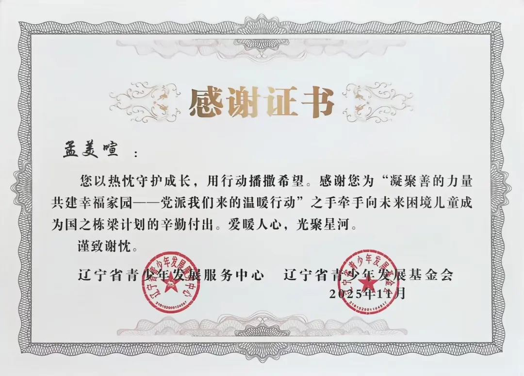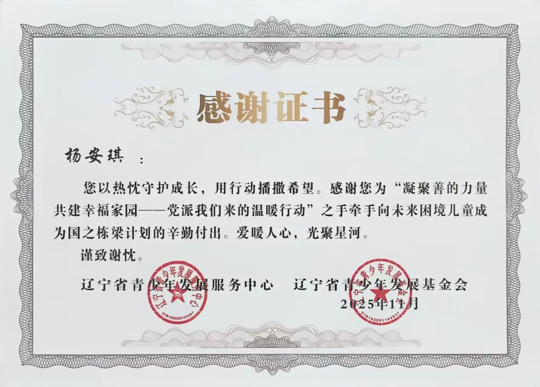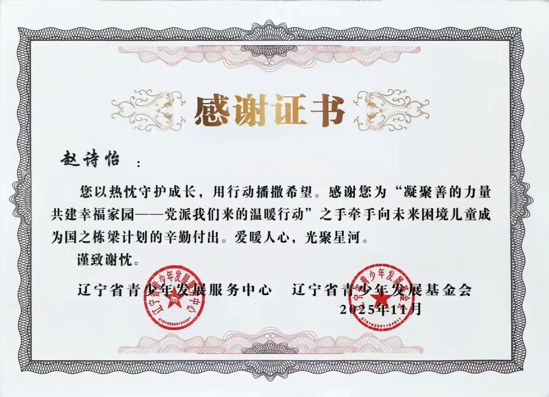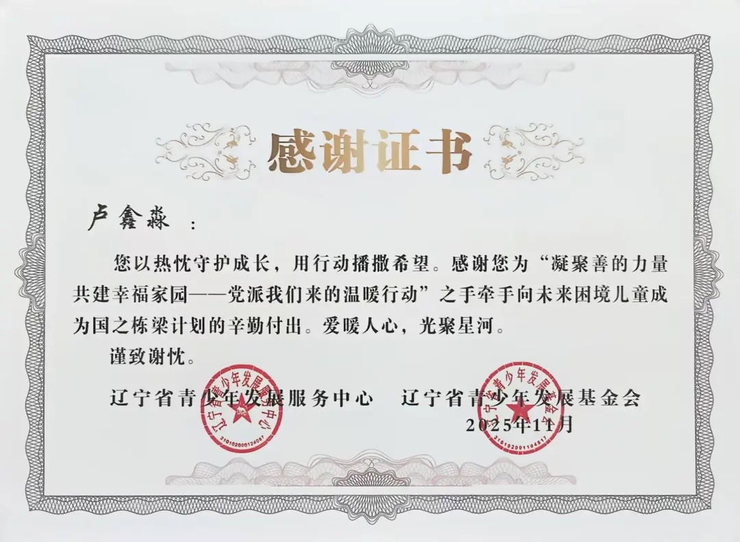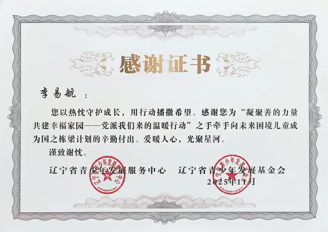 自2025年年初团省委发起“凝聚善的力量 共建幸福家园”——党派我们来的温暖行动”之手牵手向未来困境儿童成为国之栋梁计划志愿者招募以来,太阳成tyc7111cc团委高度重视,迅速组织选拔并组建了一支责任心强、富有爱心的志愿者队伍。在活动前期,志愿者们深入走访帮扶儿童家庭,详细了解每位孩子的学习、性格与兴趣,量身定制帮扶方案,真正做到“精准对接、用心服务”。在长期的帮扶过程中,志愿者们以真诚与坚持赢得了孩子们的信任,也得到了辽宁省青少年发展服务中心、辽宁省青少年发展基金会的高度认可与表彰。