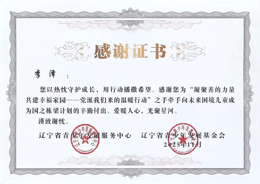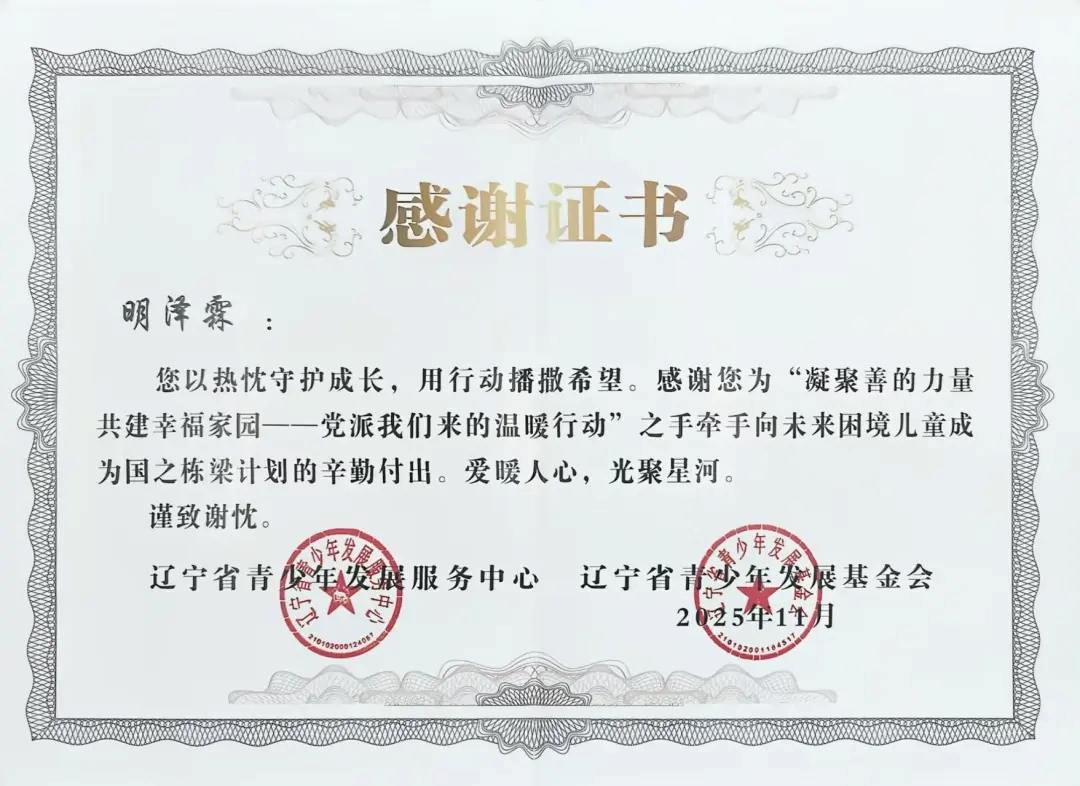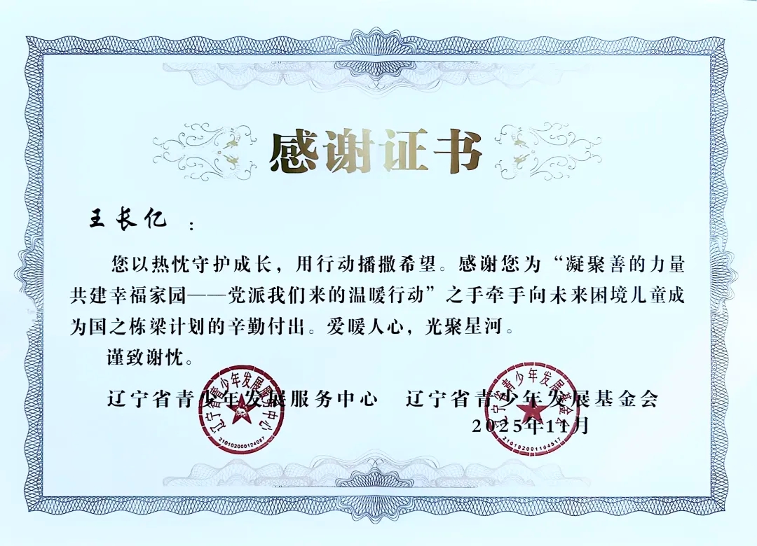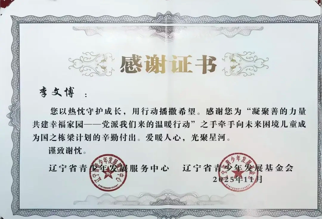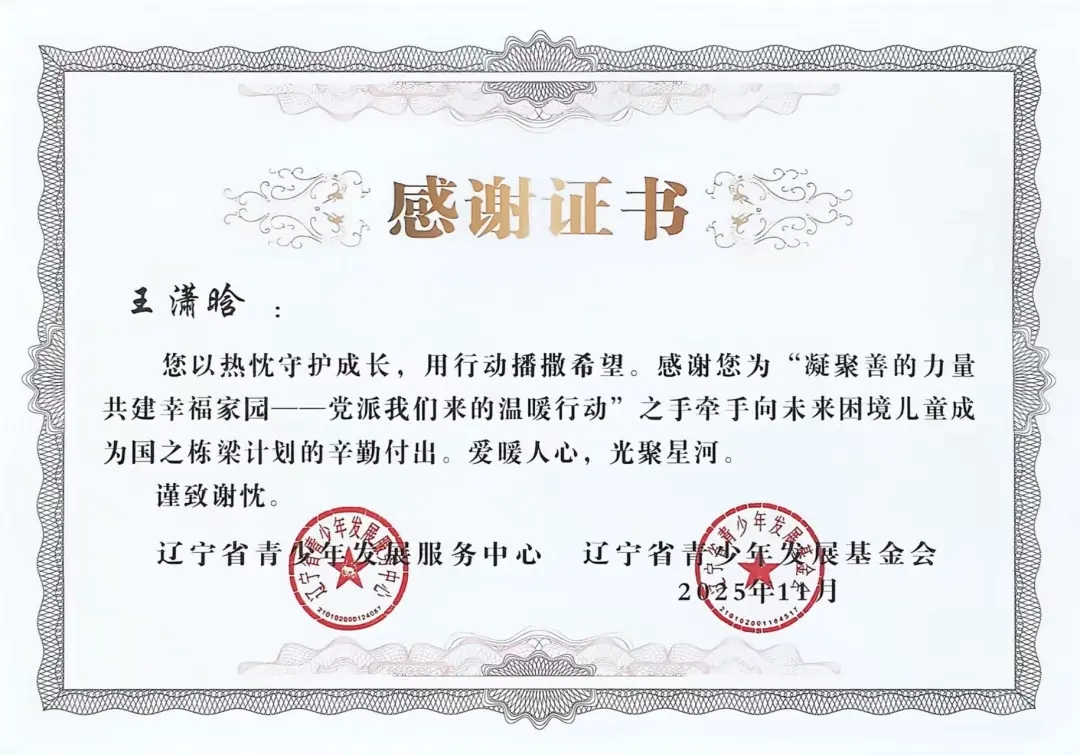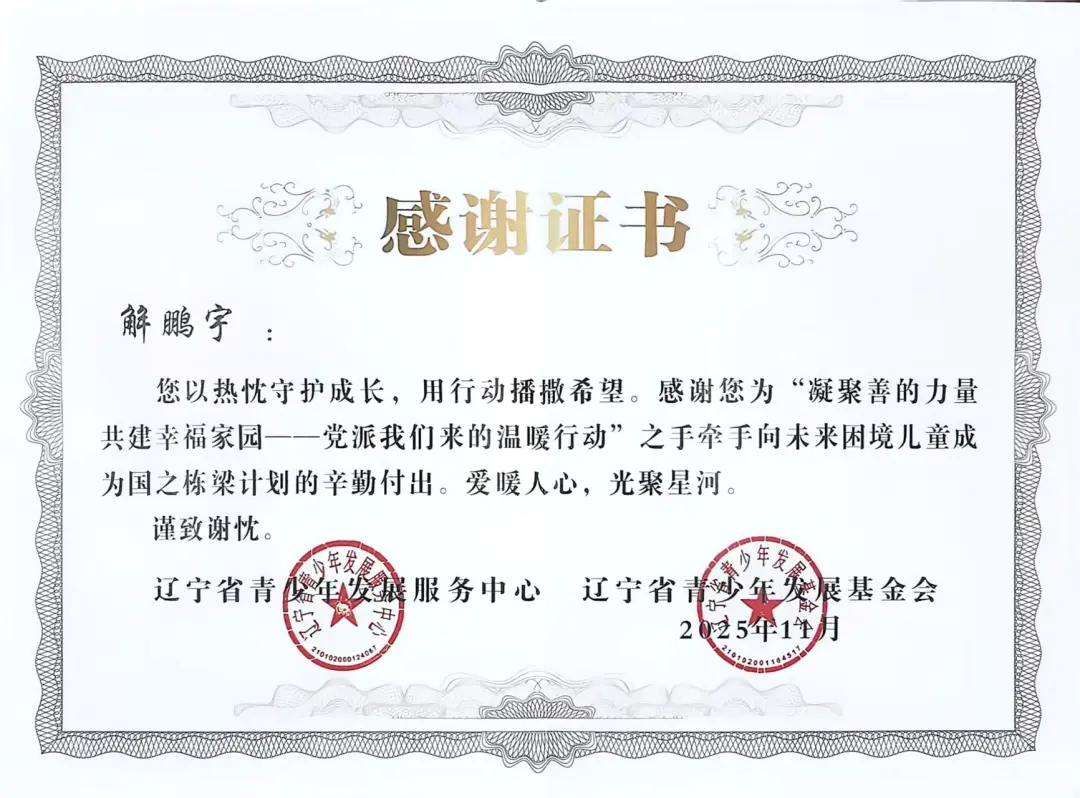 自2025年年初团省委发起“凝聚善的力量 共建幸福家园”——党派我们来的温暖行动”之手牵手向未来困境儿童成为国之栋梁计划志愿者招募以来,太阳成tyc7111cc团委高度重视,迅速组织选拔并组建了一支责任心强、富有爱心的志愿者队伍。在活动前期,志愿者们深入走访帮扶儿童家庭,详细了解每位孩子的学习、性格与兴趣,量身定制帮扶方案,真正做到“精准对接、用心服务”。在长期的帮扶过程中,志愿者们以真诚与坚持赢得了孩子们的信任,也得到了辽宁省青少年发展服务中心、辽宁省青少年发展基金会的高度认可与表彰。