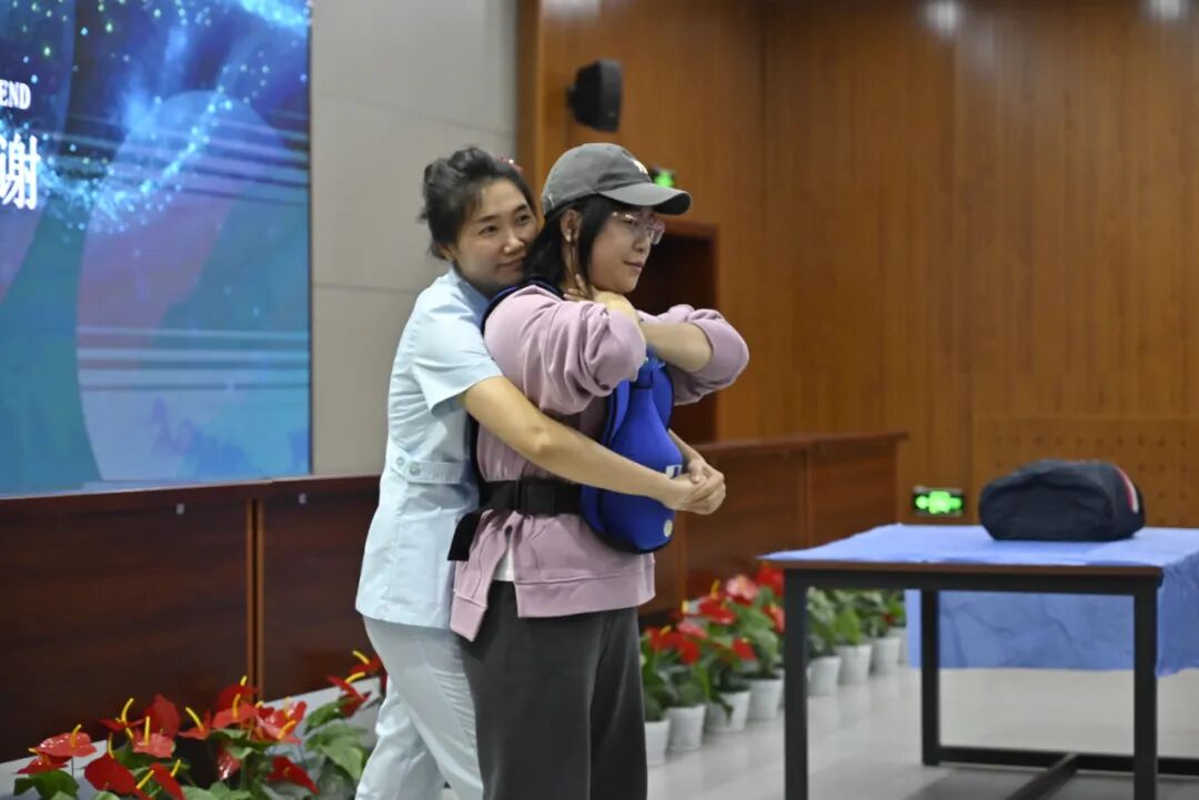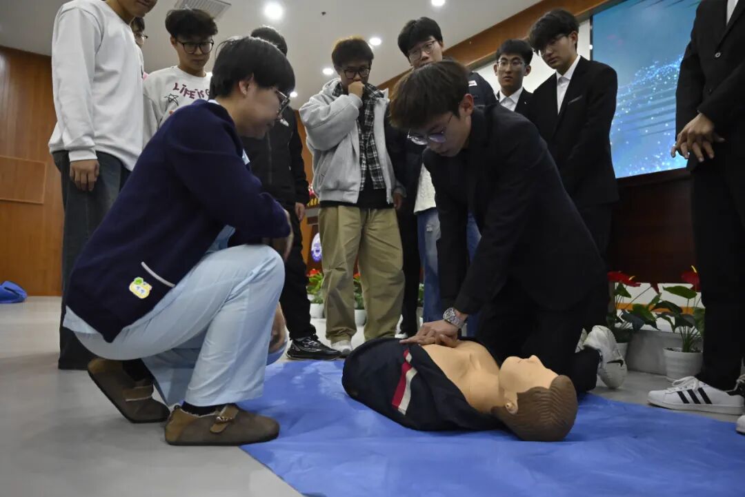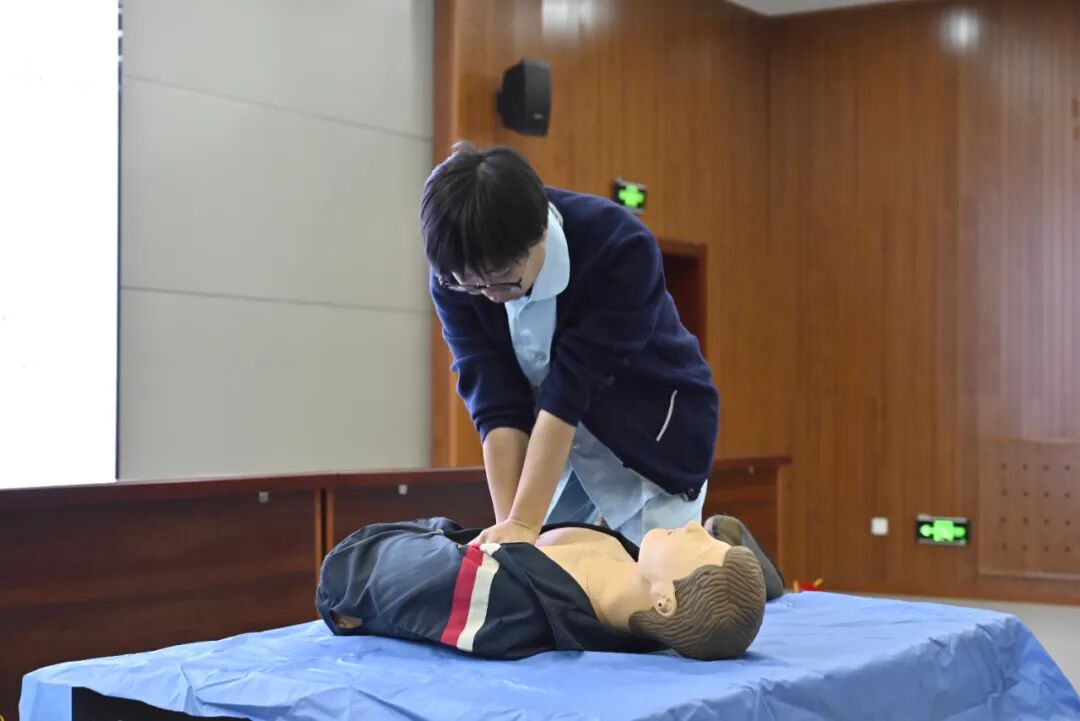 在急救知识讲座中,盛京医院麻醉科主治医师、讲师于江作了《心肺复苏急救常识》专题报告。他结合案例,系统讲解了心肺复苏的意义、流程及“黄金四分钟”的施救理念,并进行了现场实操演示。讲座结束后,多名学生主动上台,在专家的指导下现场演示了人工呼吸和海姆立克急救法的操作,通过“学练结合”的方式,让师生对急救技能有了更直观和深刻的理解。