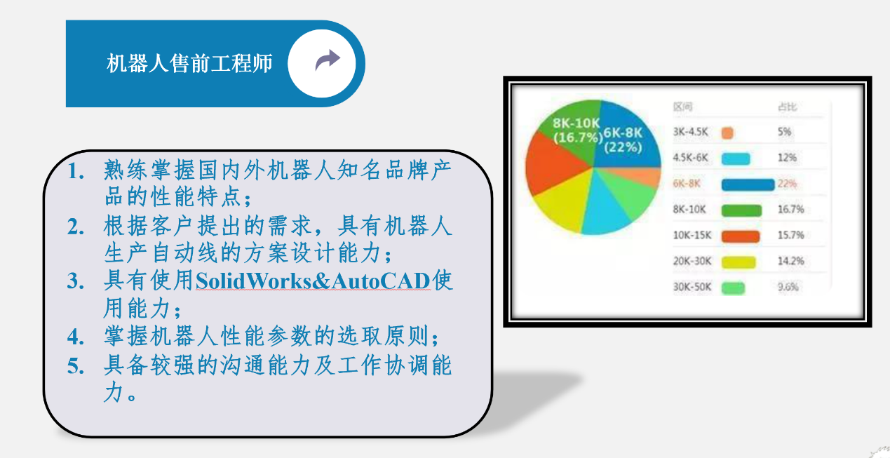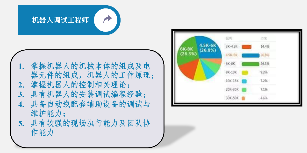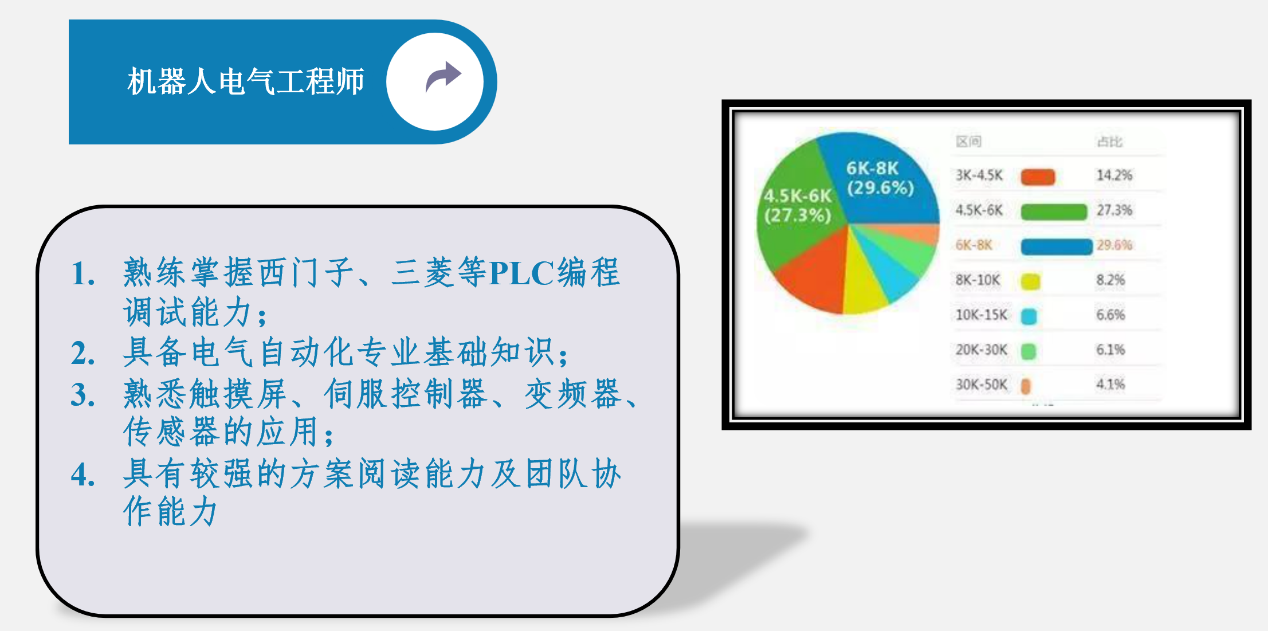 主要面向工业自动化、机器人等领域,从事工业机器人、智能机器人应用等工作。毕业生可在企业内从事智能硬件设计、系统集成、控制、调试、维护等相关工作。