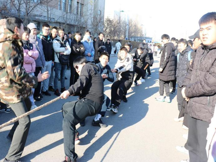 比赛开始前,双方队长握手,队员站在两侧做热身活动,随着哨声响起,比赛正式开始,双方队员同时喊起口号“一二,一二”,口号声铿锵有力,整齐响亮,场上场下融为一体,拉近了同学们之间的距离。本次比赛的赛制为三局两胜制,在这两天的拔河比赛中,每个队伍中的成员都团结一致,拼尽全力。现场的气氛热火朝天,驱散了冬日的寒冷。