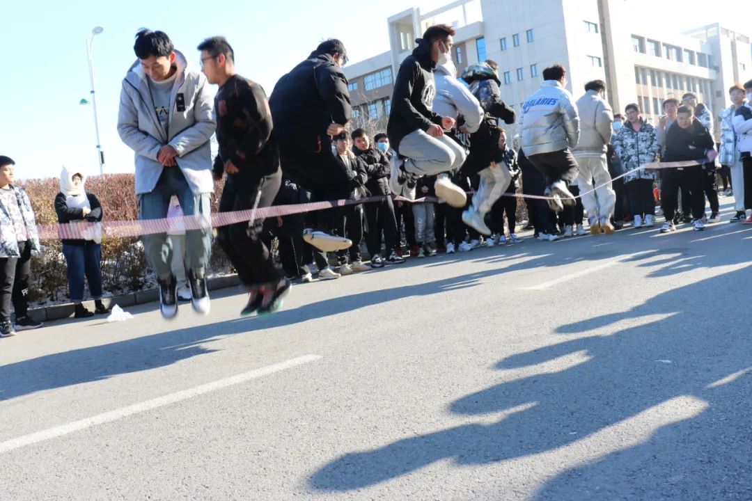 一声令下,比赛开始,绳子被同学们抡的呼呼生风,地面被打的啪啪作响。一条条长绳翻覆飞舞,绳子在空中划出优美的弧线,同学们的身影穿梭其中,一跳一跃之间尽显活力与青春。