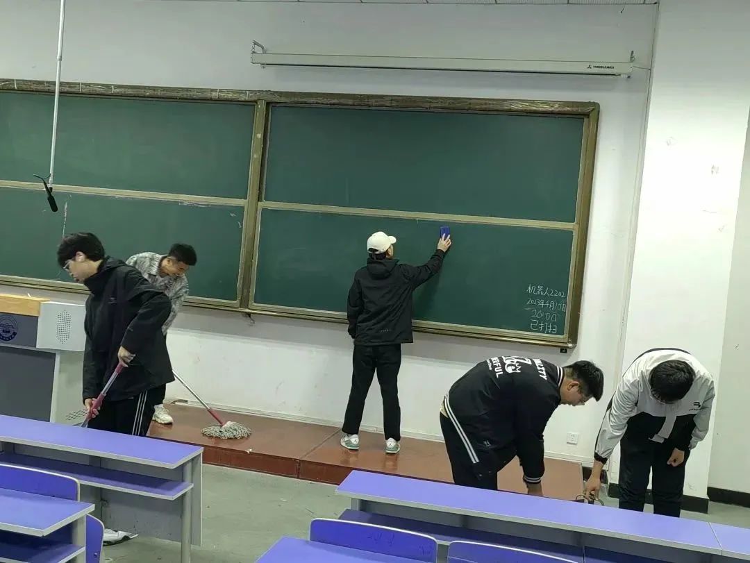 2022级辅导员带领有清扫教室任务的班级,对所负责的教室卫生进行一次彻底的卫生清扫,对课桌面、桌膛内的垃圾和油渍用湿毛巾进行擦拭,对教室窗台、窗户玻璃、黑板槽、讲台周围、教室前后门进行环境卫生清洁,对地面卫生死角要清扫到位。共同打造、整洁、干净的教室学习环境。
